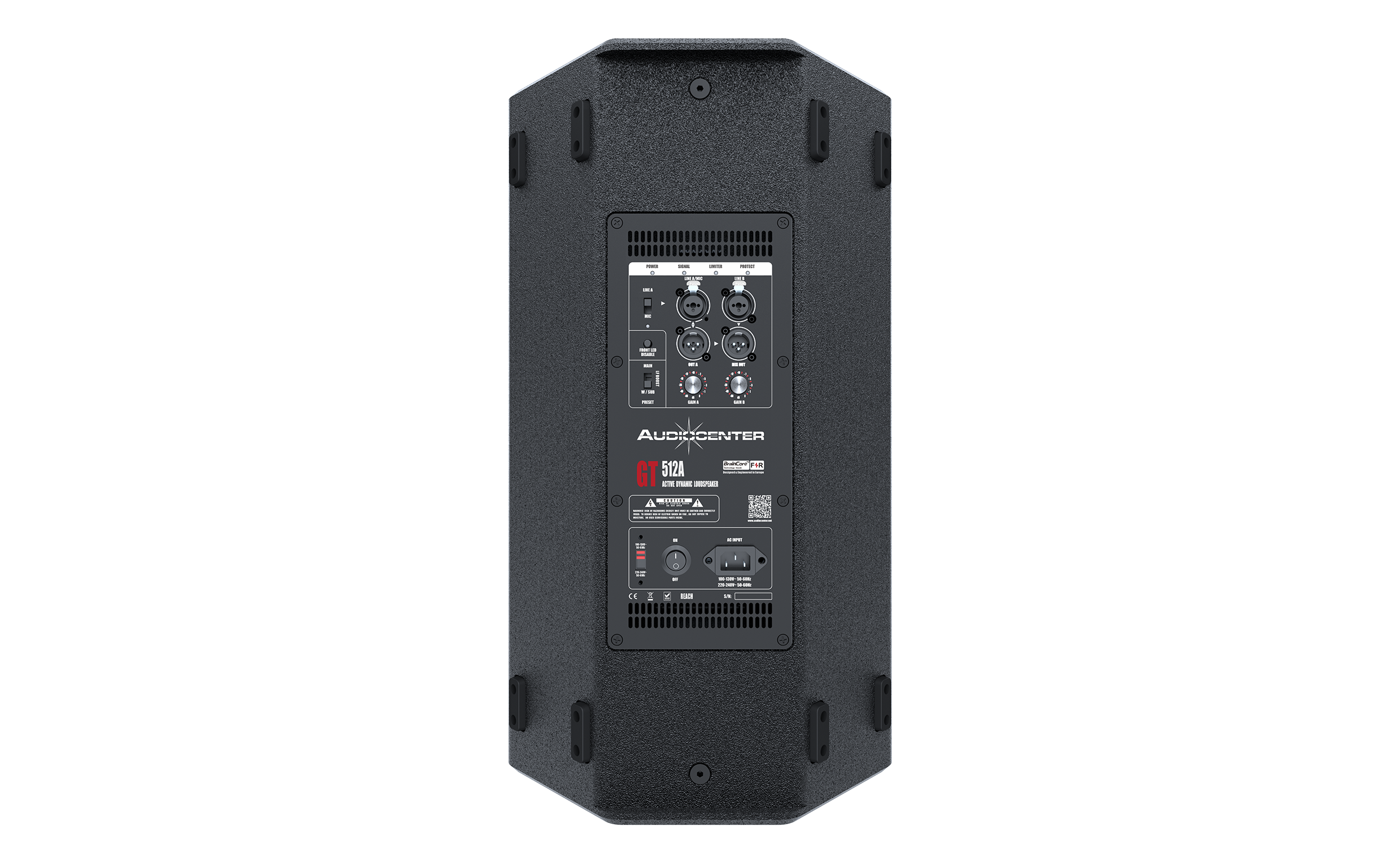 El altavoz GT512A dispone de dos entradas combo (XLR de 2 vías y jack mono 6,35). La entrada CH A puede conmutarse entre entrada de línea balanceada o entrada de micrófono. Las dos fuentes de audio pueden mezclarse internamente y emitirse como salida balanceada, transmitiendo la señal a varios altavoces para facilitar la distribución en cascada de la señal del sistema.
